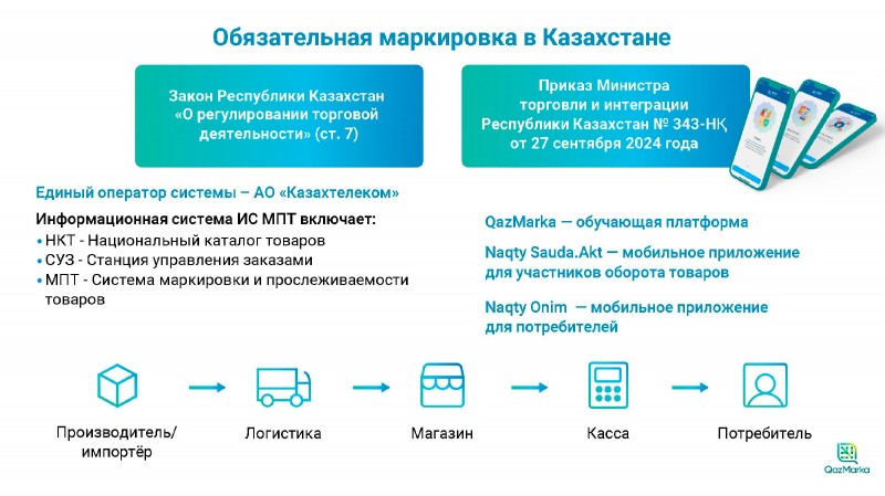 Система маркировки в Казахстане регулируется Законом Республики Казахстан о регулируемой торговой деятельности и приказом Министра торговли и интеграции Республики Казахстан №343. Единым оператором системы выступает АО «Казахтелеком», а информационная система включает национальный каталог товаров, станцию управления заказами и систему маркировки и прослеживания товаров.