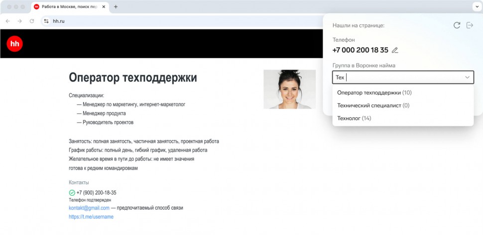 «Кандидат+» работает как браузерное расширение в Google Chrome: рекрутер открывает резюме на Headhunter, нажимает кнопку расширения, выбирает группу для сохранения, и контакт моментально добавляется в систему. Это значительно ускоряет процесс подбора и повышает точность работы. Чтобы сохранять кандидатов в группы, их нужно предварительно создать в личном кабинете «Воронки найма».