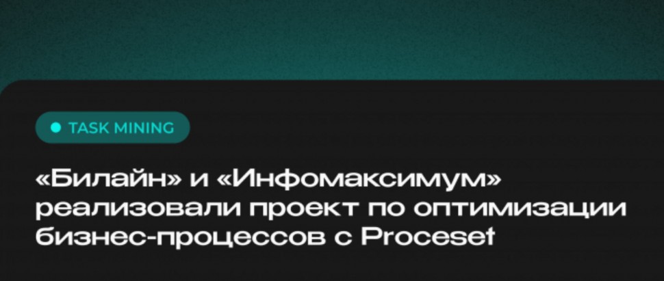 «Билайн» совместно с компанией «Инфомаксимум» успешно завершили пилотный проект по использованию Task Mining для выявления и оцифровки рутинных операций в 10 ключевых бизнес-процессах компании. Используемое программное решение — система активной бизнес-аналитики Proceset.
