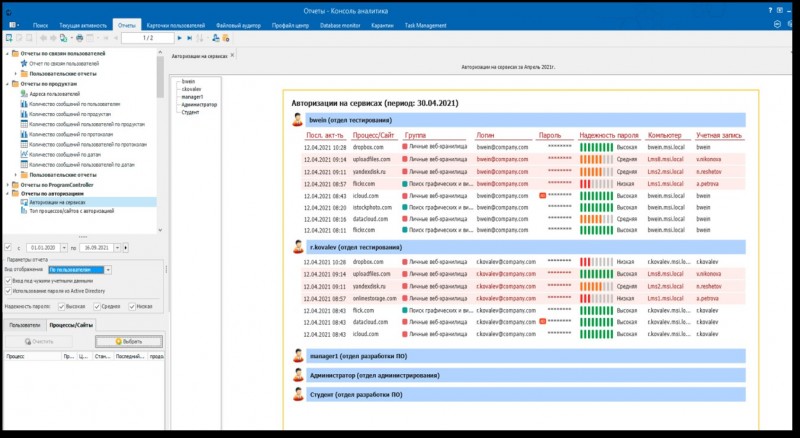 Среди преимуществ DLP-системы «СёрчИнформ КИБ» заказчик выделяет гибкий поиск, встроенные инструменты аналитики и подробные отчеты, доступные в Analytic Console. В системе насчитывается более 30 шаблонов. К примеру, отчет по авторизациям на сервисах собирает и анализирует логины и пароли пользователей на различных ресурсах. Фиксирует, на каких сервисах сотрудник вводит учетные данные, насколько надежны данные для входа. Информирует об использовании сотрудником корпоративных логина и пароля на внешних сервисах.